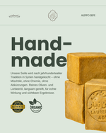 Hergestellt in Aleppo von einer syrischen Familie mit über 50 Jahren Seifenherstellungstradition.
