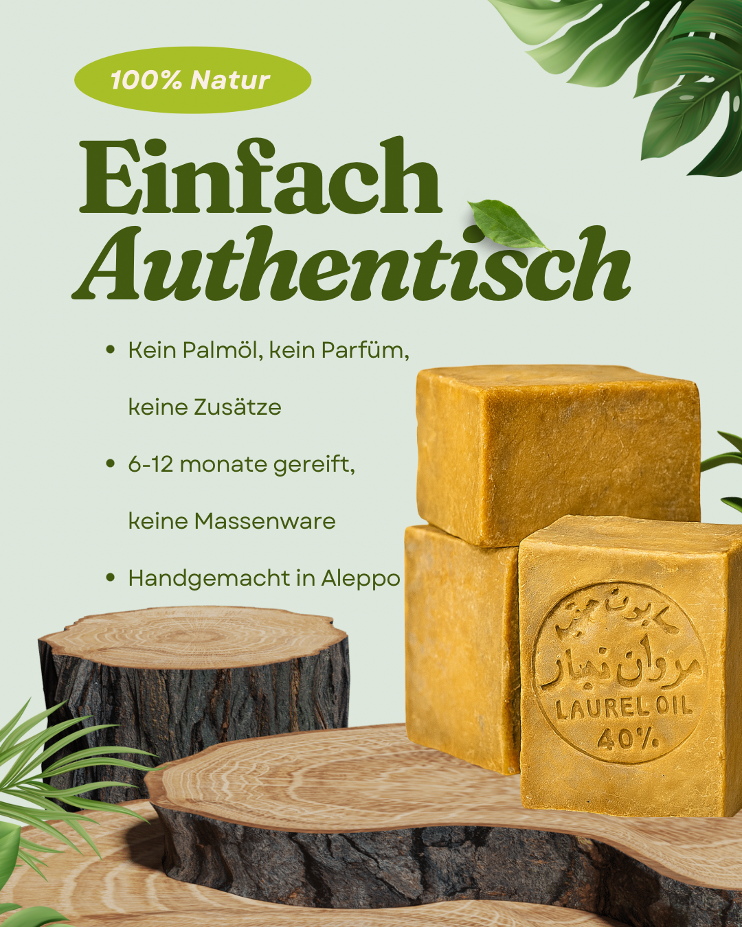 Viele „Aleppo-Seifen“ sind gestreckt, unreif und nur dem Namen nach echt – was am Ende deine Haut bezahlt. Unsere wird traditionell in Aleppo hergestellt, monatelang gereift und besteht aus nur vier reinen Zutaten. Keine Zusätze, keine Kompromisse – nur echte Qualität, die sich auszahlt.
